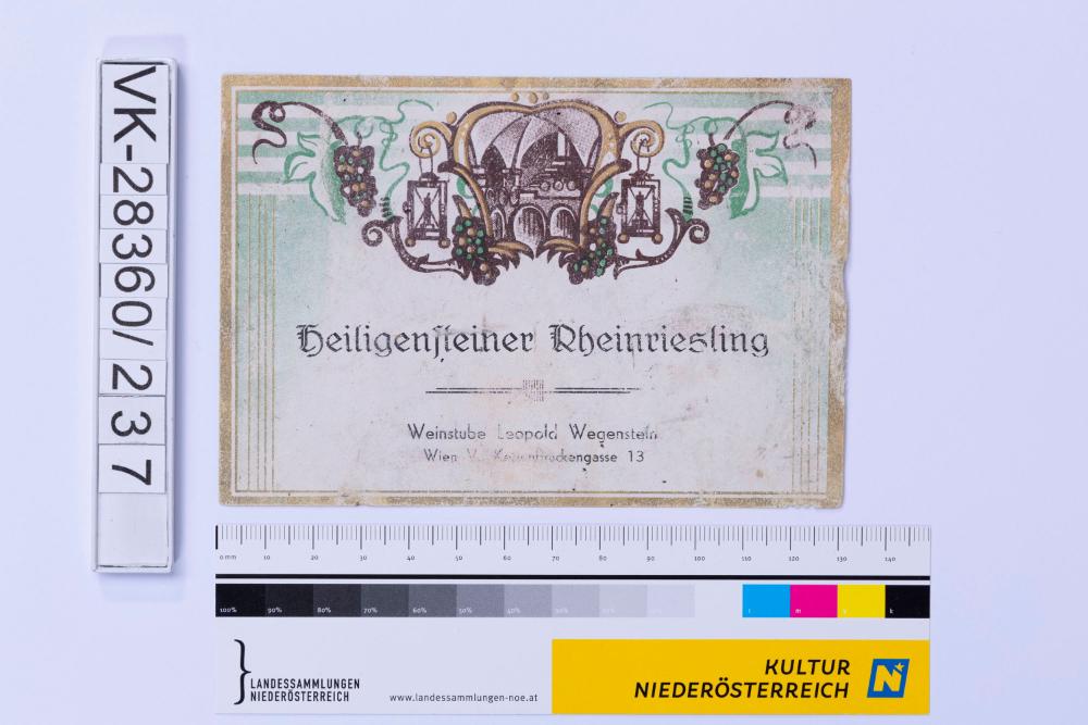 Abgelöstes Weinflaschenetikett aus einer Sammlung von den 1940er bis zu den frühen 1960er Jahren; Weinsorte: "Heiligensteiner Rheinriesling", Darstellung eines Weinkellers mit Laterne und Weinreben; Weinbau, Kellerei bzw. Handel: "Weinstube Leopold Wegenstein Wien V. Kettenbrückengasse 13"