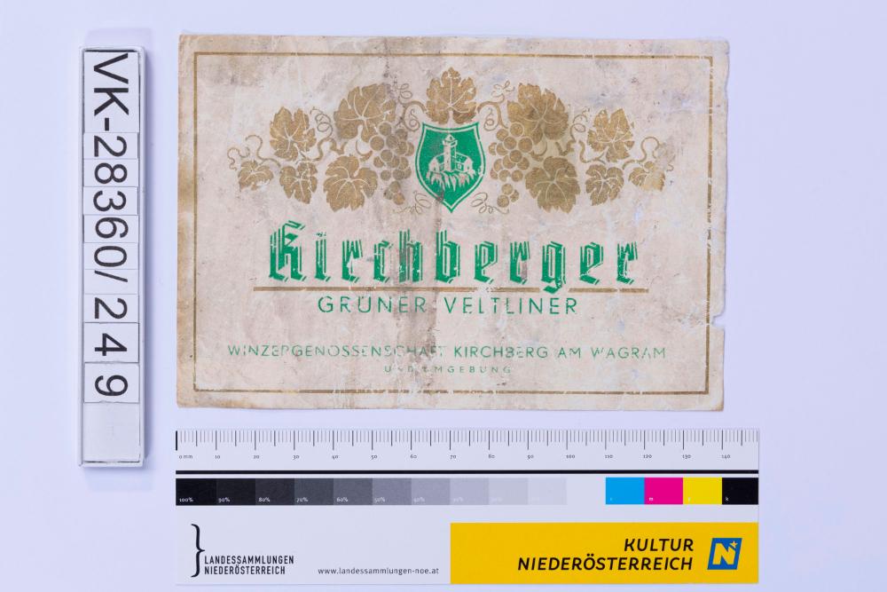 Abgelöstes Weinflaschenetikett aus einer Sammlung von den 1940er bis zu den frühen 1960er Jahren; Weinsorte: "Kirchenberger GRÜNER VELTLINER", Wappendarstellung mit Weinreben; Weinbau, Kellerei bzw. Handel: "WINZERGENOSSENSCHAFT KIRCHBERG A. WAGRAM UND UMGEBUNG"