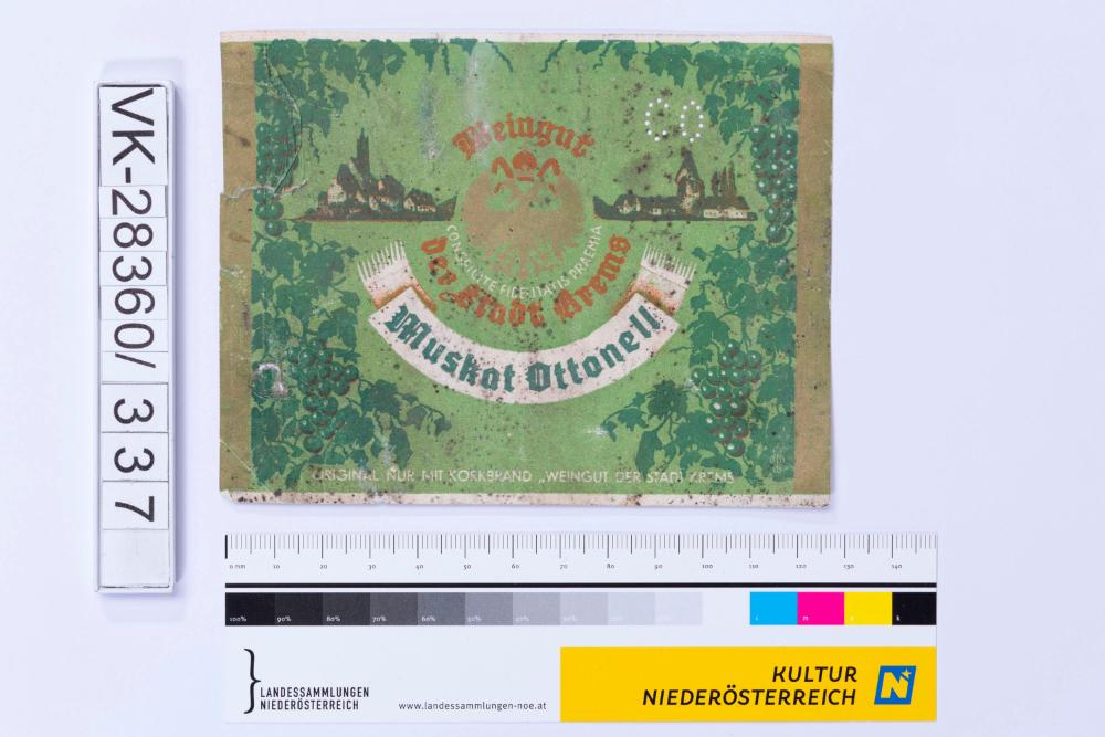 Abgelöstes Weinflaschenetikett aus einer Sammlung von den 1940er bis zu den frühen 1960er Jahren; Weinsorte: "Muskat Ottonell", Wappenzeichen und Stadtansichten; Weinbau, Kellerei bzw. Handel: "Weingut der Stadt Krems"