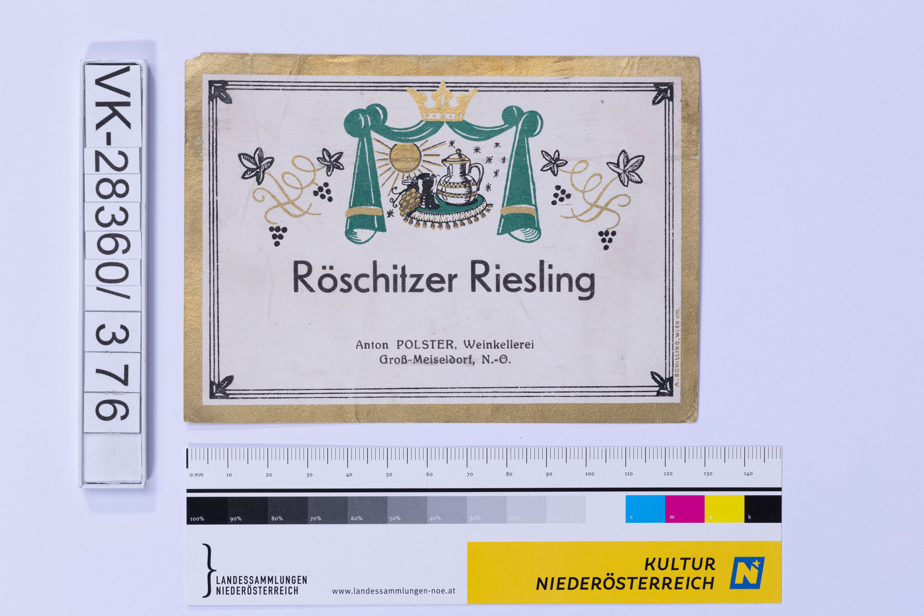 Abgelöstes Weinflaschenetikett aus einer Sammlung von den 1940er bis zu den frühen 1960er Jahren; Weinsorte: "Röschitzer Riesling", Darstellung von einem Weinkrug, -glas und -reben; Weinbau, Kellerei bzw. Handel: "Anton POLSTER, Weinkellerei Groß-Meiseldorf, N.-Ö."