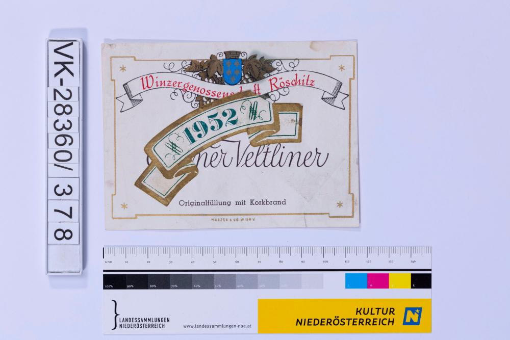 Abgelöstes Weinflaschenetikett aus einer Sammlung von den 1940er bis zu den frühen 1960er Jahren; Weinsorte: "Grüner Veltliner", Wappendarstellung mit Weinreben; Weinbau, Kellerei bzw. Handel: "Winzergenossenschaft Röschitz"