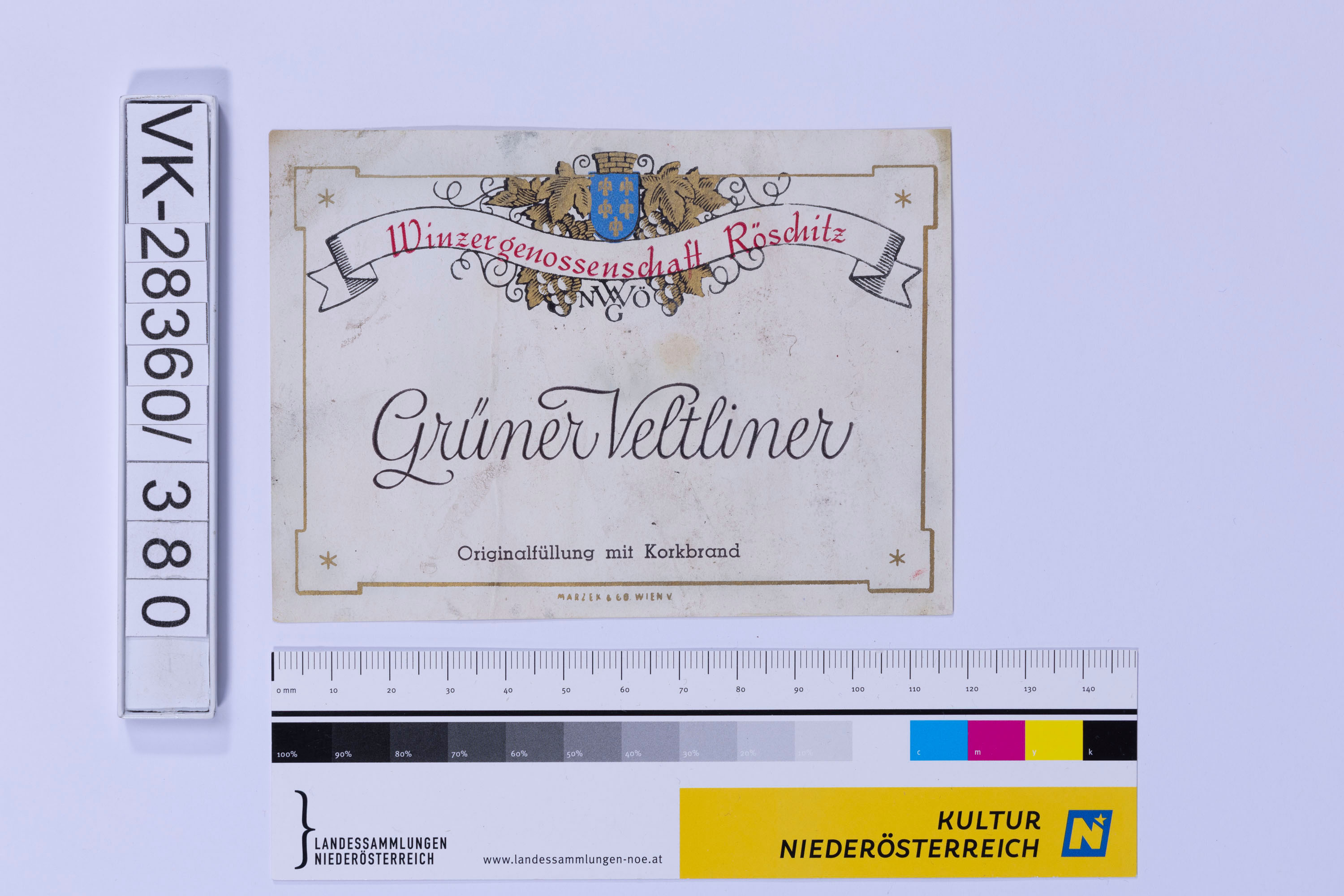 Abgelöstes Weinflaschenetikett aus einer Sammlung von den 1940er bis zu den frühen 1960er Jahren; Weinsorte: "Grüner Veltliner", Wappendarstellung mit Weinreben; Weinbau, Kellerei bzw. Handel: "Winzergenossenschaft Röschitz"