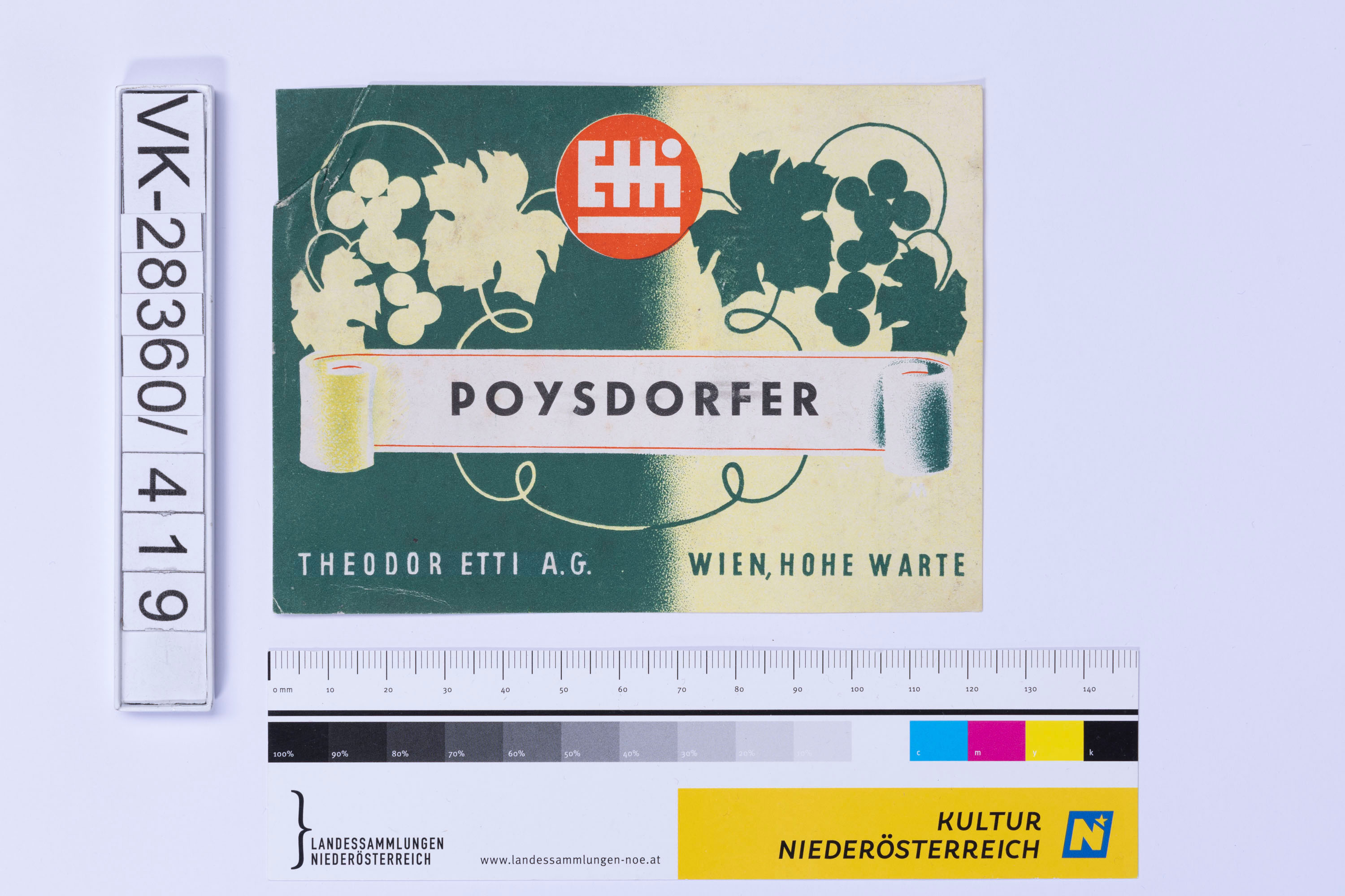 Abgelöstes Weinflaschenetikett aus einer Sammlung von den 1940er bis zu den frühen 1960er Jahren; Weinsorte: "POYSDORFER", Markenzeichen mit Weinreben; Weinbau, Kellerei bzw. Handel: "THEODOR ETTI A.G. WIEN, HOHE WARTE"
