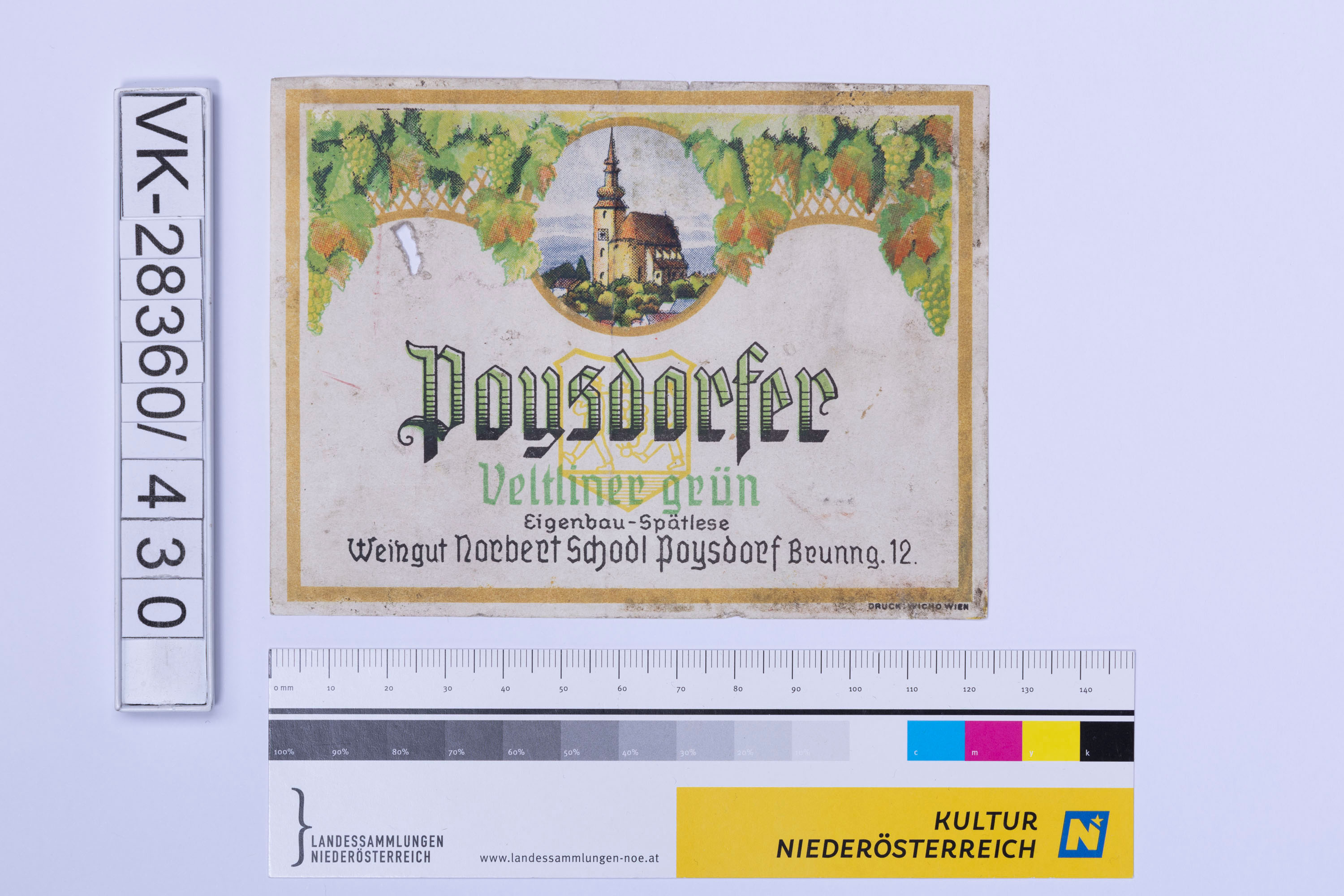 Abgelöstes Weinflaschenetikett aus einer Sammlung von den 1940er bis zu den frühen 1960er Jahren; Weinsorte: "Poysdorfer Veltliner grün", Kirchendarstellung mit Weinreben; Weinbau, Kellerei bzw. Handel: "Weingut Norbert Schodl Poysdorf Brunng. 12"