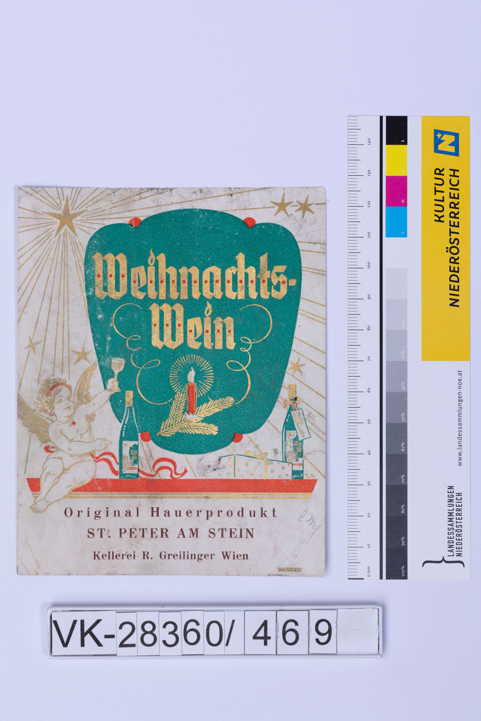 Abgelöstes Weinflaschenetikett aus einer Sammlung von den 1940er bis zu den frühen 1960er Jahren; Weinsorte: "Weihnachts-Wein", Darstellung von einem Engel mit Weinglas- und flasche mit Geschenke; Weinbau, Kellerei bzw. Handel: "Original Hauerprodukt ST.PETER AM STEIN Kellerei R. Greilinger Wien"