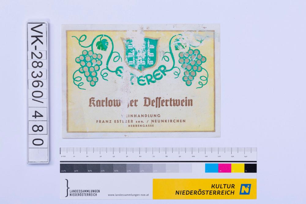 Abgelöstes Weinflaschenetikett aus einer Sammlung von den 1940er bis zu den frühen 1960er Jahren; Weinsorte: "Karlowitzer Dessertwein", Wappendarstellung mit Weinreben; Weinbau, Kellerei bzw. Handel: "WEINHANDLUNG FRANZ ESTERER sen./NEUNKIRCHEN HERRENGASSE"