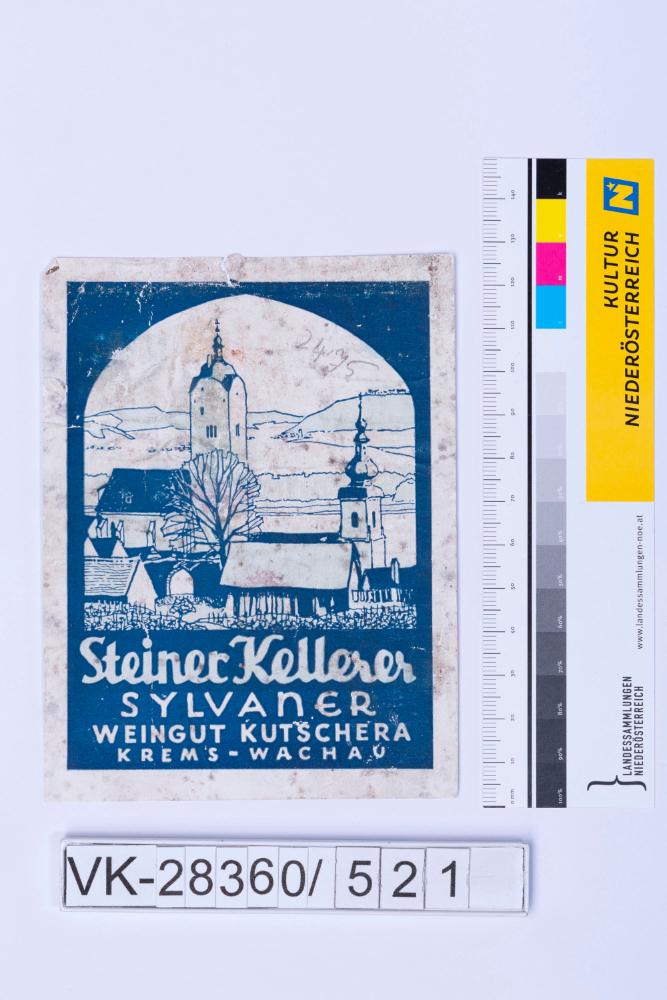 Abgelöstes Weinflaschenetikett aus einer Sammlung von den 1940er bis zu den frühen 1960er Jahren; Weinsorte: "Steiner Kellerer SYLVANER", Stadtansicht; Weinbau, Kellerei bzw. Handel: "WEINGUT KUTSCHERA KREMS-WACHAU"