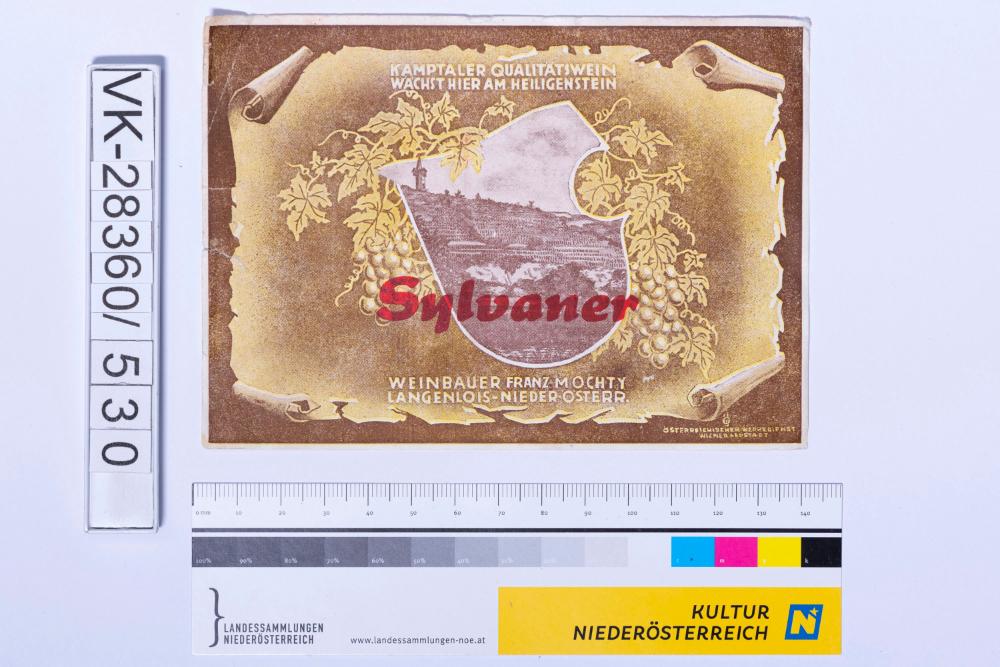 Abgelöstes Weinflaschenetikett aus einer Sammlung von den 1940er bis zu den frühen 1960er Jahren; Weinsorte: "Sylvaner", Stadtansicht und Weinreben; Weinbau, Kellerei bzw. Handel: "WEINBAUER FRANZ MOCHTY LANGENLOIS-NIEDERÖSTERR."