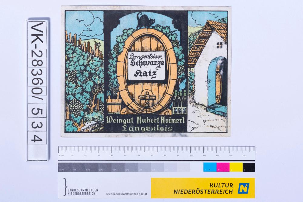 Abgelöstes Weinflaschenetikett aus einer Sammlung von den 1940er bis zu den frühen 1960er Jahren; Weinsorte: "Langenloiser Schwarze Katz", Darstellung von einer Katze, Weinreben, - fass und -keller; Weinbau, Kellerei bzw. Handel: "Weingut Hubert Haimerl Langenlois"