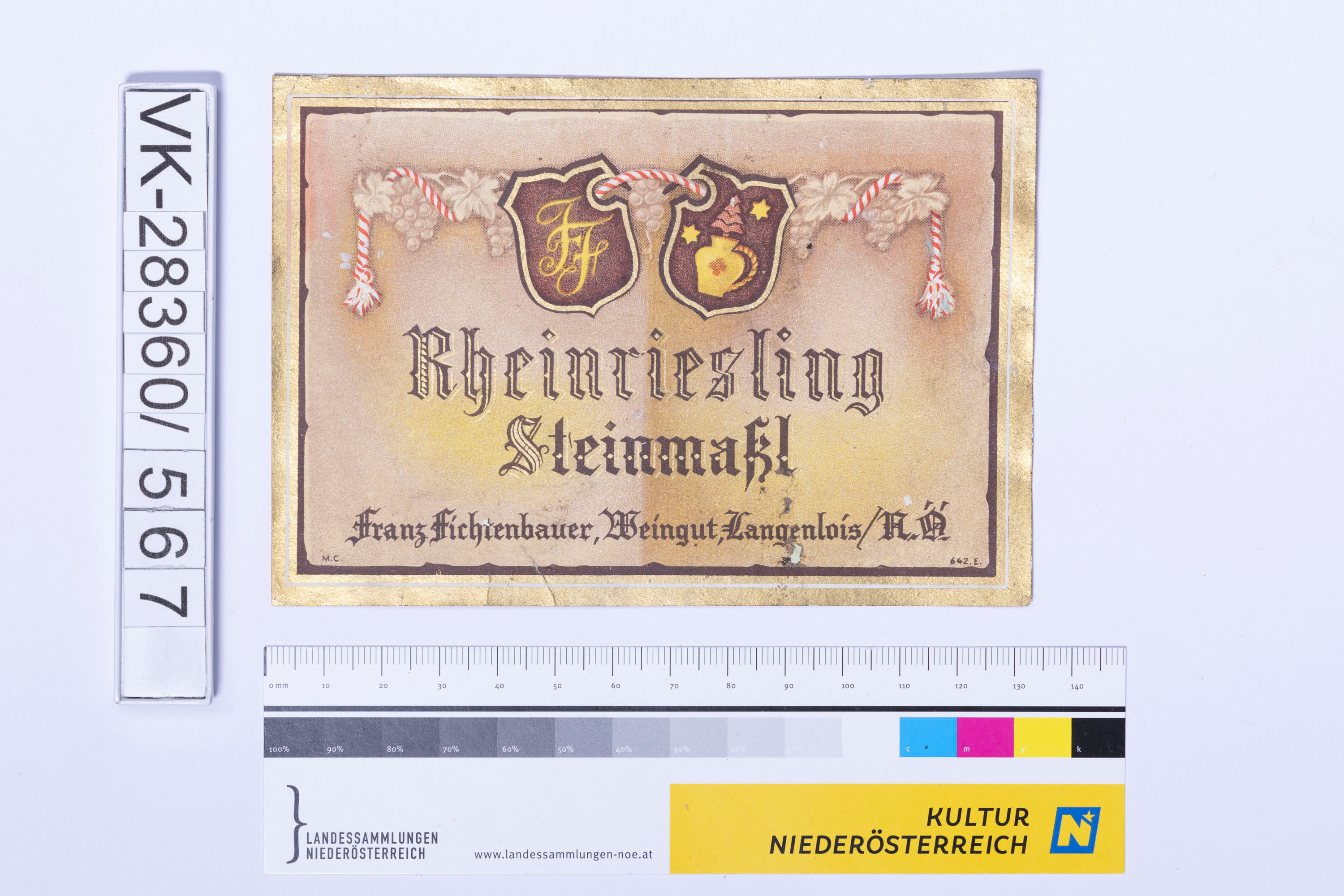 Abgelöstes Weinflaschenetikett aus einer Sammlung von den 1940er bis zu den frühen 1960er Jahren; Weinsorte: "Rheinriesling Steinmaßl", Wappendarstellung; Weinbau, Kellerei bzw. Handel: "Franz Fichtenbauer, Weingut=Langenlois/N.Ö."