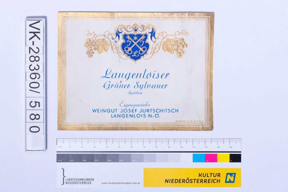 Abgelöstes Weinflaschenetikett aus einer Sammlung von den 1940er bis zu den frühen 1960er Jahren; Weinsorte: "Langenloiser Grüner Sylvaner", Wappendarstellung mit Weinreben; Weinbau, Kellerei bzw. Handel: "WEINGUT JOSEF JURTSCHITSCH LANGENLOIS N.-Ö."