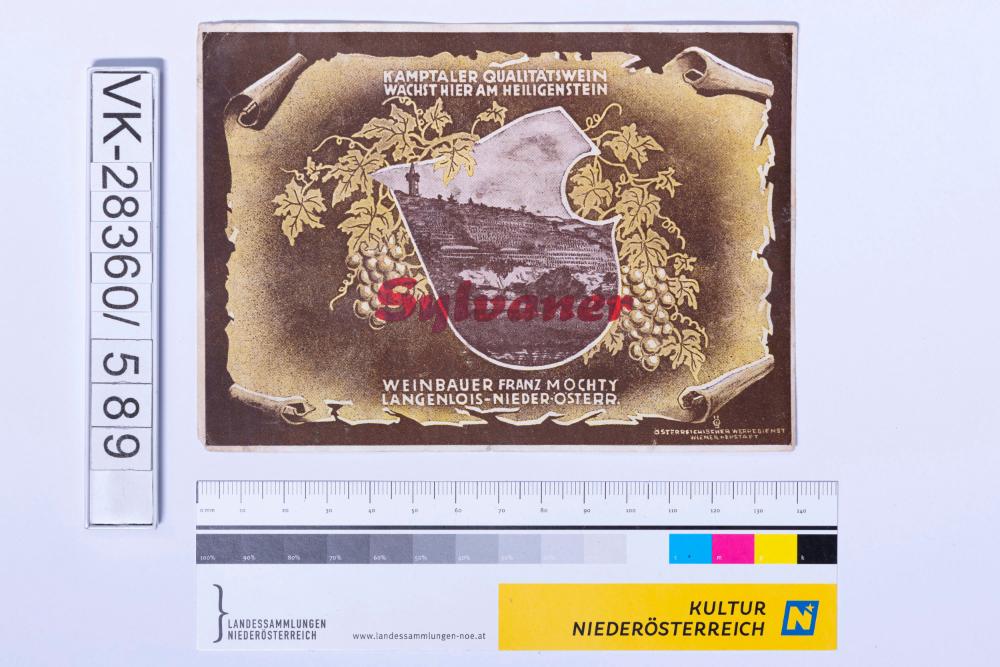 Abgelöstes Weinflaschenetikett aus einer Sammlung von den 1940er bis zu den frühen 1960er Jahren; Weinsorte: "Sylvaner", Stadtansicht und Weinreben; Weinbau, Kellerei bzw. Handel: "WEINBAUER FRANZ MOCHTY LANGENLOIS-NIEDERÖSTERR."