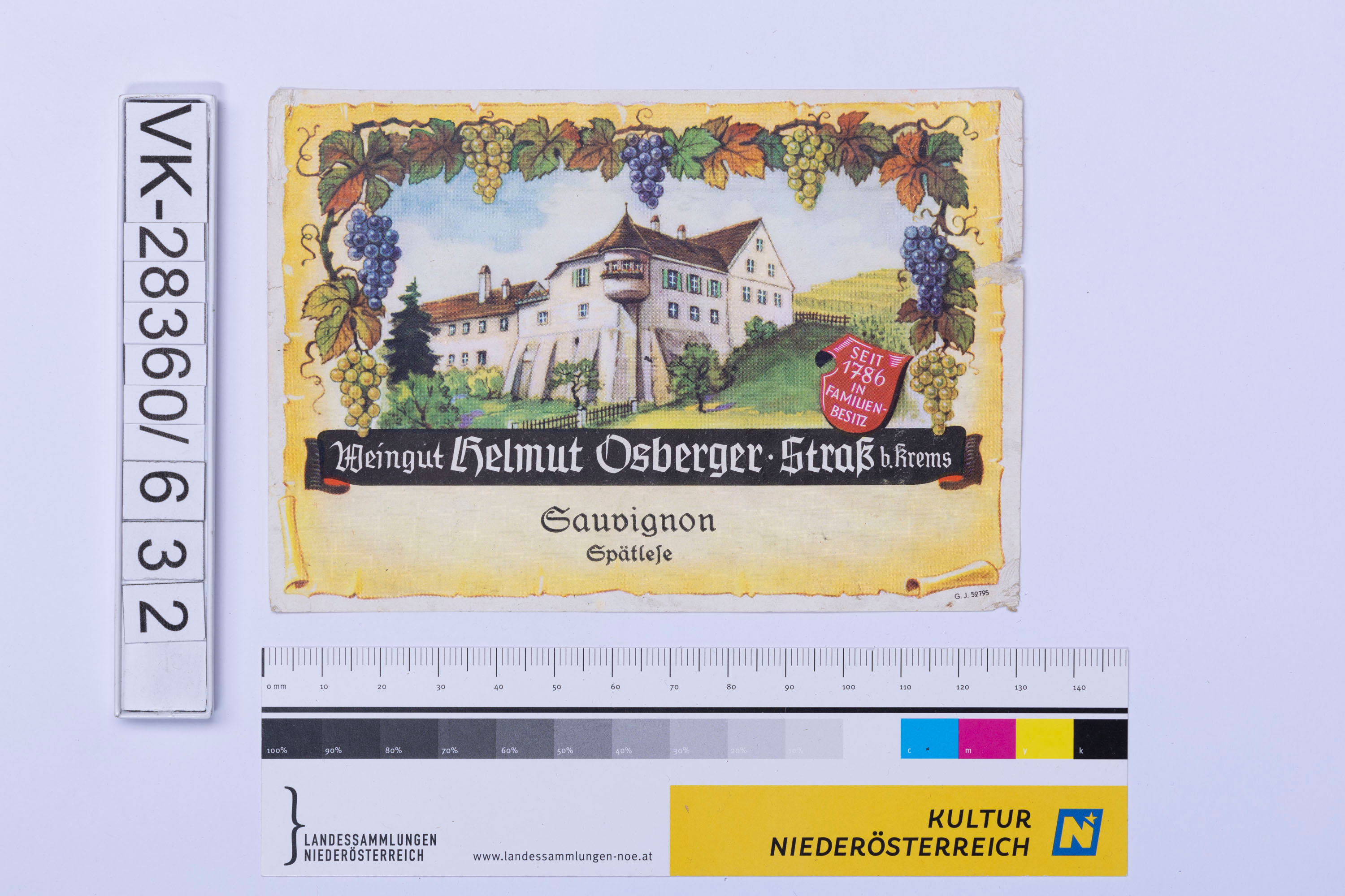 Abgelöstes Weinflaschenetikett aus einer Sammlung von den 1940er bis zu den frühen 1960er Jahren; Weinsorte: "Sauvignon Spätlese", Darstellung eines Weingutes; Weinbau, Kellerei bzw. Handel: "Weingut Helmut Osberger Straß b. Krems"