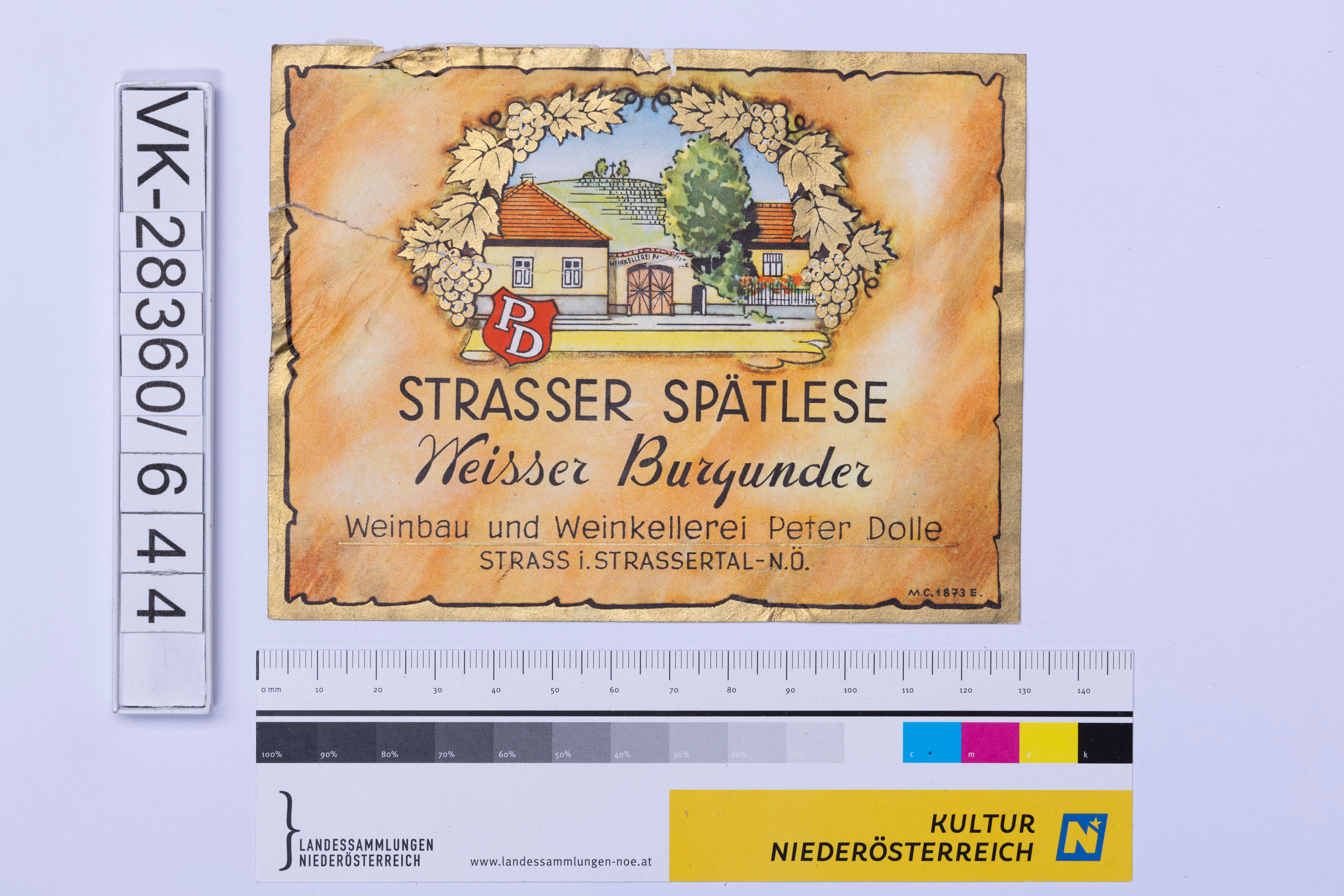 Abgelöstes Weinflaschenetikett aus einer Sammlung von den 1940er bis zu den frühen 1960er Jahren; Weinsorte: "STRASSER SPÄTLESE Weisser Burgunder", Darstellung eines Weinkellers; Weinbau, Kellerei bzw. Handel: "Weinbau und Weinkellerei Peter Dolle STRASS i. STRASSERTAL - N.Ö."