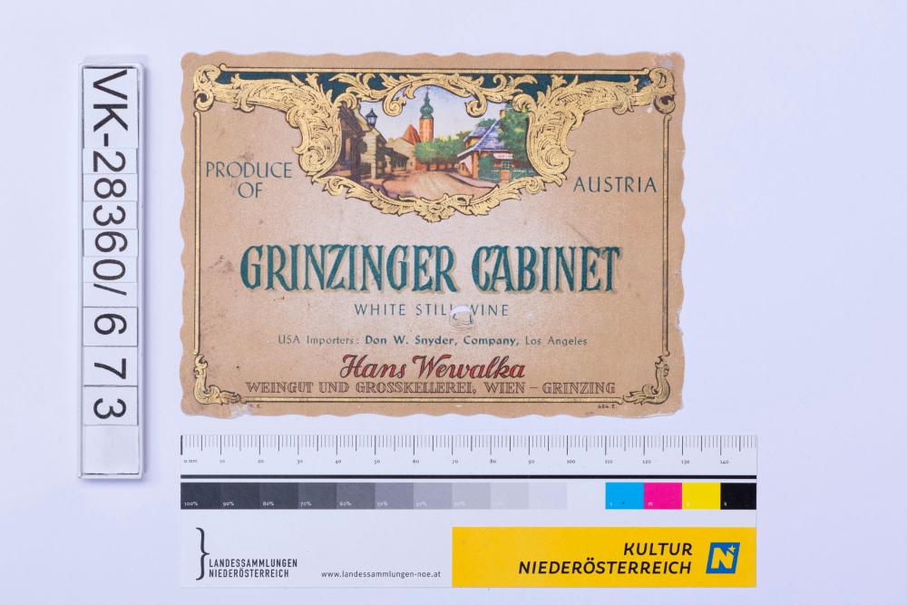 Abgelöstes Weinflaschenetikett aus einer Sammlung von den 1940er bis zu den frühen 1960er Jahren; Weinsorte: "GRINZINGER CABINET WHITE STILL WINE", Stadtansicht; Weinbau, Kellerei bzw. Handel: "Hans Wewalka WEINGUT UND GROSSKELLEREI, WIEN-GRINZING"; Importeur: "Don W. Snyder, Company, Los Angeles"