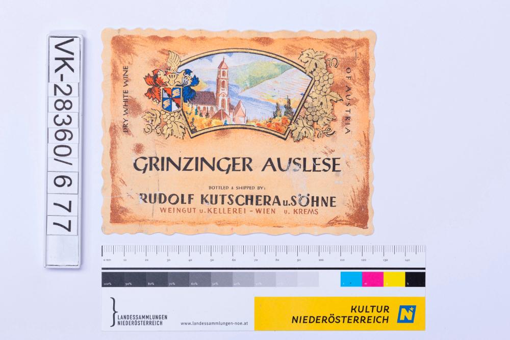 Abgelöstes Weinflaschenetikett aus einer Sammlung von den 1940er bis zu den frühen 1960er Jahren; Weinsorte: "GRINZINGER AUSLESE"; Stadtansicht und Wappendarstellung mit Weinreben; Weinbau, Kellerei bzw. Handel: "BOTTLED & SHIPPED BY: RUDOLF KUTSCHERA u. SÖHNE WEINGUT u. KELLEREI - WIEN u. KREMS"