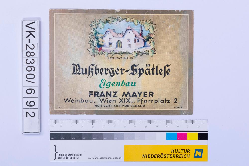 Abgelöstes Weinflaschenetikett aus einer Sammlung von den 1940er bis zu den frühen 1960er Jahren; Weinsorte: "Nußberger-Spätlese", Darstellung Beethovenhaus; Weinbau, Kellerei bzw. Handel: "FRANZ MAYER Weinbau, Wien XIX., Pfarrplatz 2"