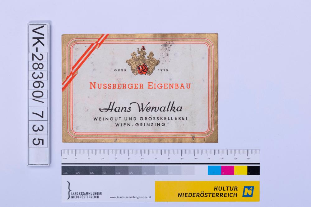 Abgelöstes Weinflaschenetikett aus einer Sammlung von den 1940er bis zu den frühen 1960er Jahren; Weinsorte: "NUSSBERGER EIGENBAU", Wappendarstellung; Weinbau, Kellerei bzw. Handel: Hans Wewalka WEINGUT UND GROSSKELLEREI WIEN GRINZING"
