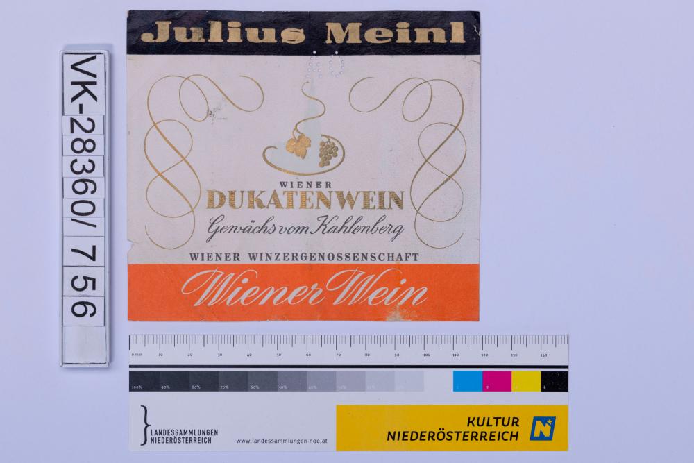 Abgelöstes Weinflaschenetikett aus einer Sammlung von den 1940er bis zu den frühen 1960er Jahren; Weinsorte: "WIENER DUKATENWEIN", Darstellung von Weinreben; "Julius Meinl WIENER WINZERGENOSSENSCHAFT"