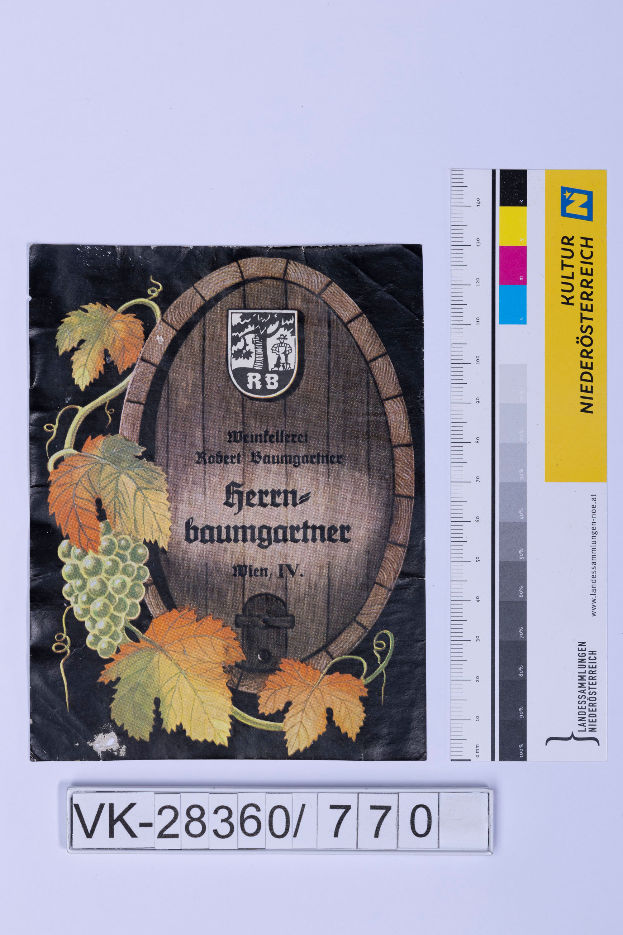 Abgelöstes Weinflaschenetikett aus einer Sammlung von den 1940er bis zu den frühen 1960er Jahren; Darstellung: Weinfass und Reben; Weinbau, Kellerei bzw. Handel: "Weinkellerei Robert Baumgartner Herrnbaumgartner Wien, IV."
