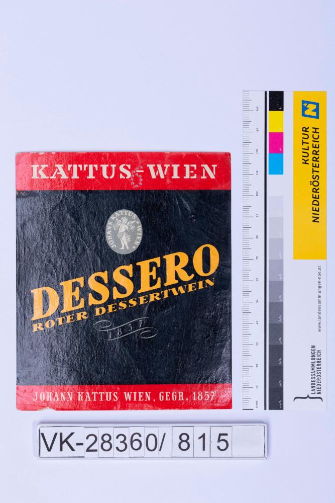 Abgelöstes Weinflaschenetikett aus einer Sammlung von den 1940er bis zu den frühen 1960er Jahren; Weinsorte. "DESSERO ROTER DESSERTWEIN", Markenzeichen; Weinbau, Kellerei bzw. Handel: "JOHANN KATTUS WIEN, GEGR. 1857"