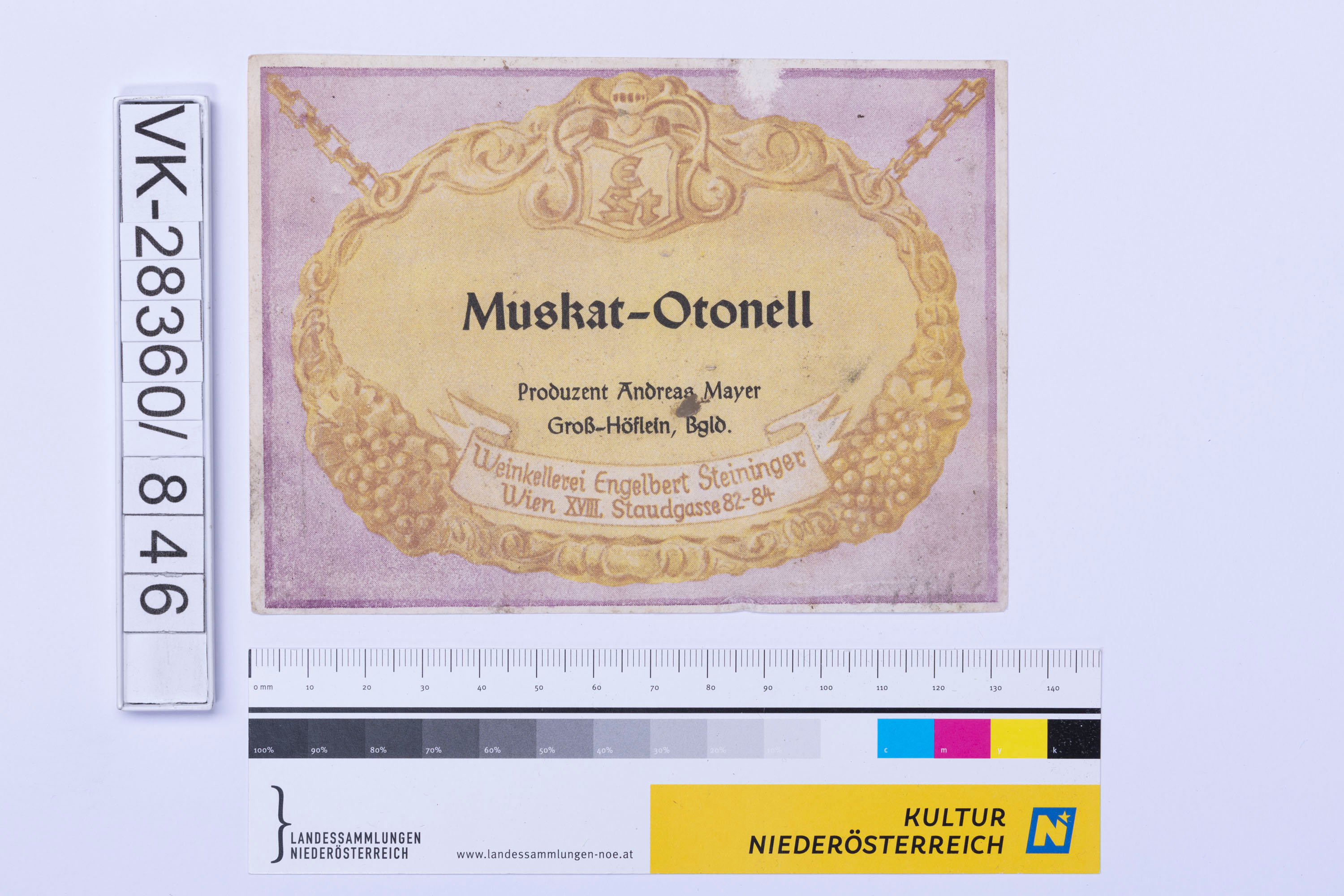 Abgelöstes Weinflaschenetikett aus einer Sammlung von den 1940er bis zu den frühen 1960er Jahren; Weinsorte: "Muskat-Otonell", Wappendarstellung und Weinreben; Produzent: "Andreas Mayer Groß-Höflein, Bgld."; Weinbau, Kellerei bzw. Handel: "Weinkellerei Engelbert Steininger Wien XVIII. Staudgasse 82-84"