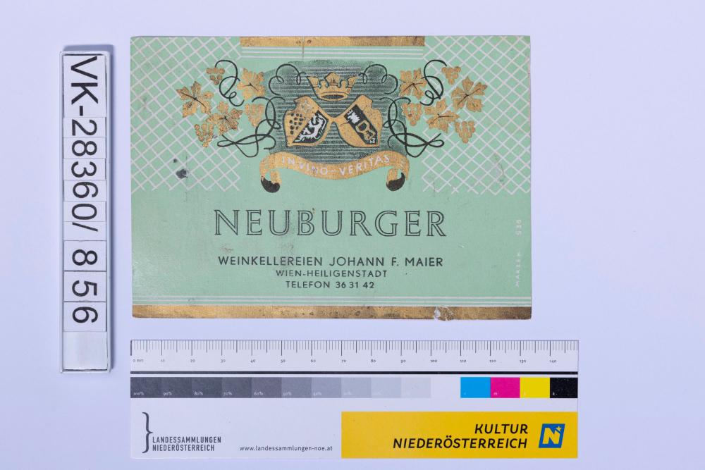 Abgelöstes Weinflaschenetikett aus einer Sammlung von den 1940er bis zu den frühen 1960er Jahren; Weinsorte: "NEUBURGER", Wappendarstellung mit Krone und Weinreben; Weinbau, Kellerei bzw. Handel: "WEINKELLEREIEN JOHANN F. MAIER WIEN-HEILIGENSTADT TELEFON 363142"