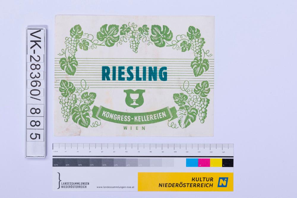 Abgelöstes Weinflaschenetikett aus einer Sammlung von den 1940er bis zu den frühen 1960er Jahren; Weinsorte: "RIESLING", Darstellung von Weinreben; Weinbau, Kellerei bzw. Handel: "KONGRESS-KELLEREIEN WIEN"