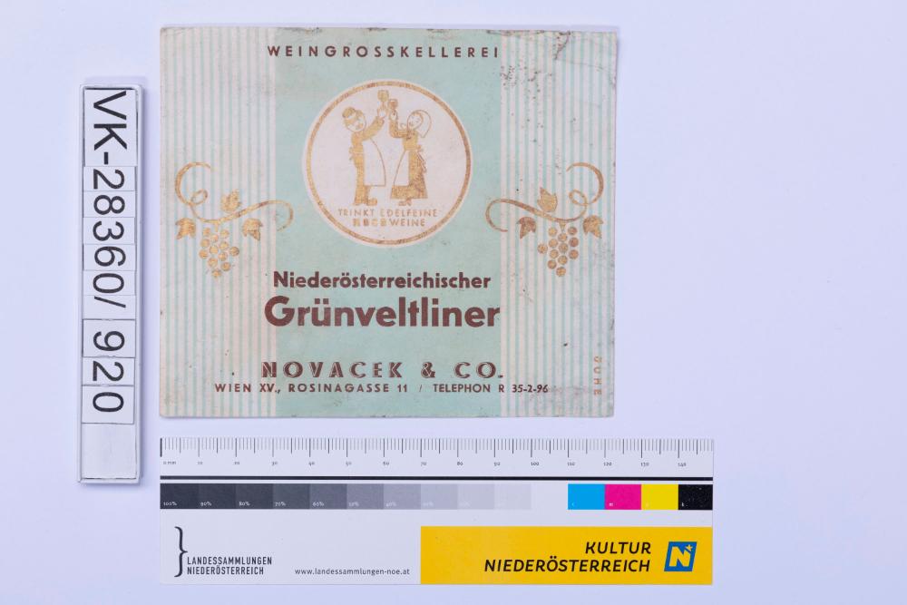 Abgelöstes Weinflaschenetikett aus einer Sammlung von den 1940er bis zu den frühen 1960er Jahren; Weinsorte: "Niederösterreichischer Grünveltliner", Darstellung eines Mannes und einer Frau mit Weingläsern, Weinbau, Kellerei bzw. Handel: "NOVACEK & CO. Wien XV., ROSINAGASSE 11/TELEPHON R 35-2-96"