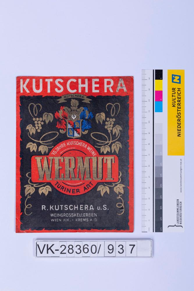 Abgelöstes Weinflaschenetikett aus einer Sammlung von den 1940er bis zu den frühen 1960er Jahren; Weinsorte: "WERMUT TURINER ART", Wappendarstellung und Weinreben; Weinbau, Kellerei bzw. Handel: "R. KUTSCHERA u. S. WEINGROSSKELLEREIEN WIEN XIX. - KREMS A/D."