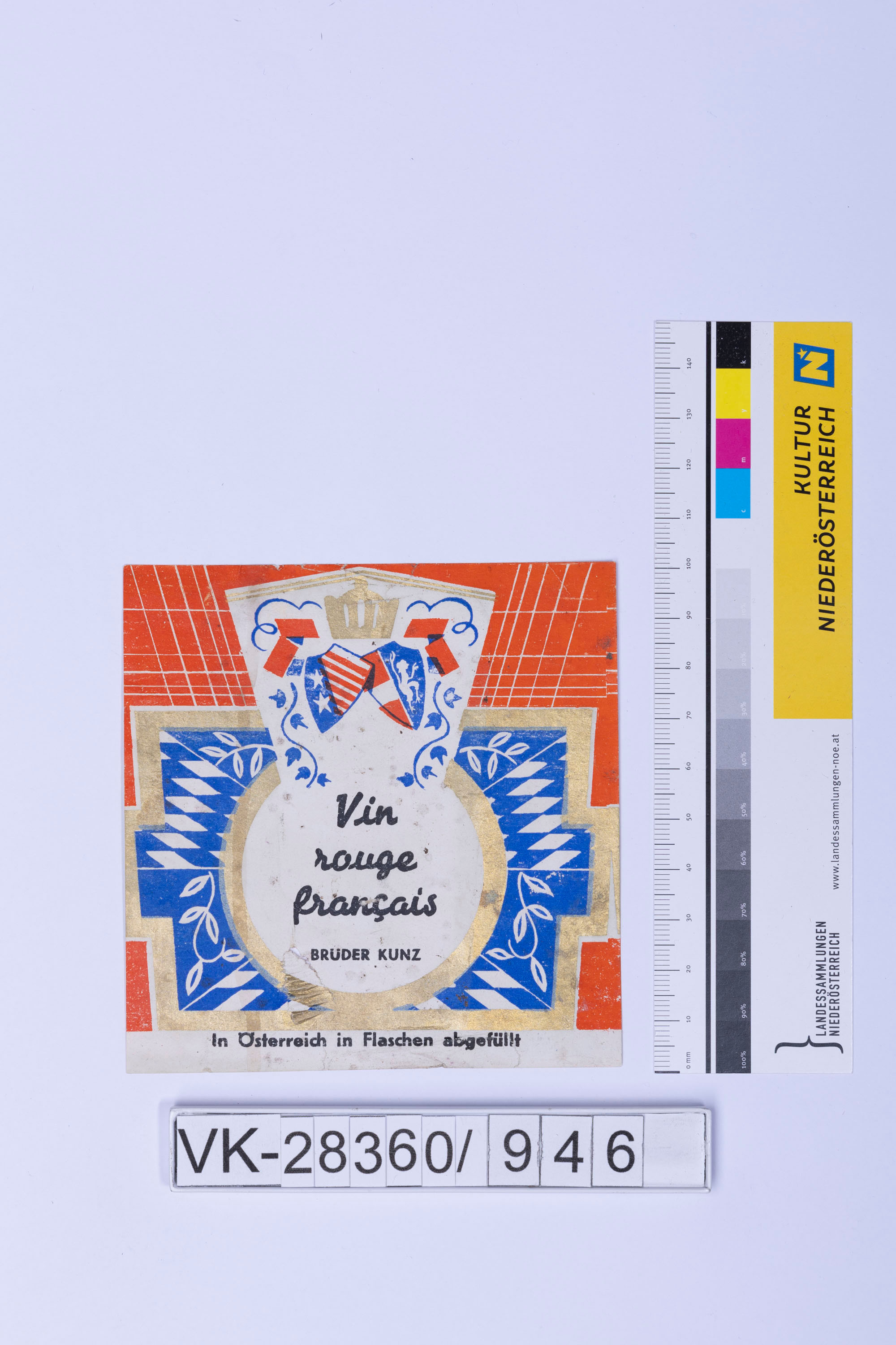 Abgelöstes Weinflaschenetikett aus einer Sammlung von den 1940er bis zu den frühen 1960er Jahren; Weinsorte: "Vin rouge français", Wappendarstellung; Weinbau, Kellerei bzw. Handel: "BRÜDER KUNZ"