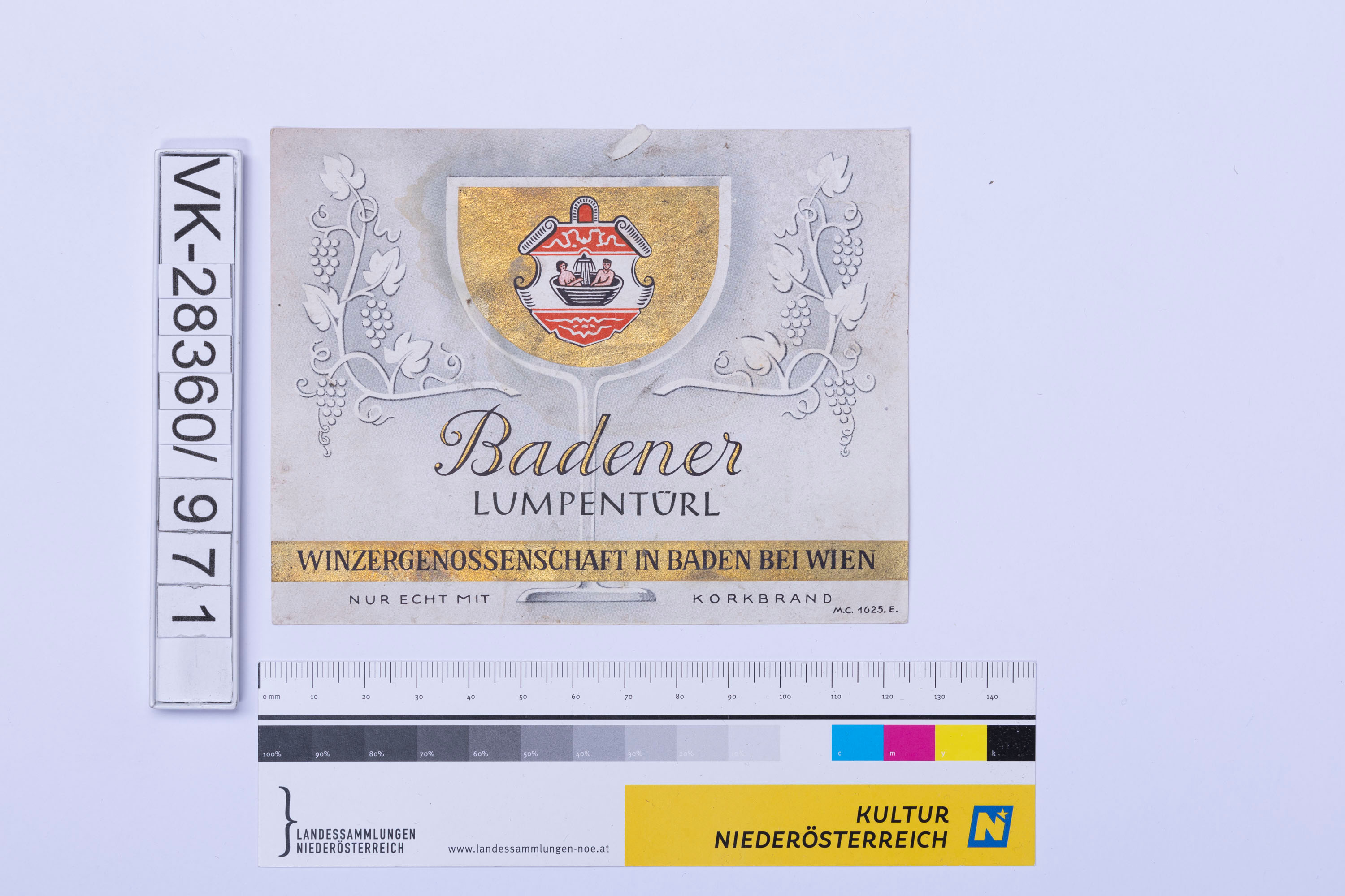 Abgelöstes Weinflaschenetikett aus einer Sammlung von den 1940er bis zu den frühen 1960er Jahren; Weinsorte: "Badener LUMPENTÜRL", Wappendarstellung und Weinreben"; Weinbau, Kellerei bzw. Handel: "WINZERGENOSSENSCHAFT IN BADEN BEI WIEN"