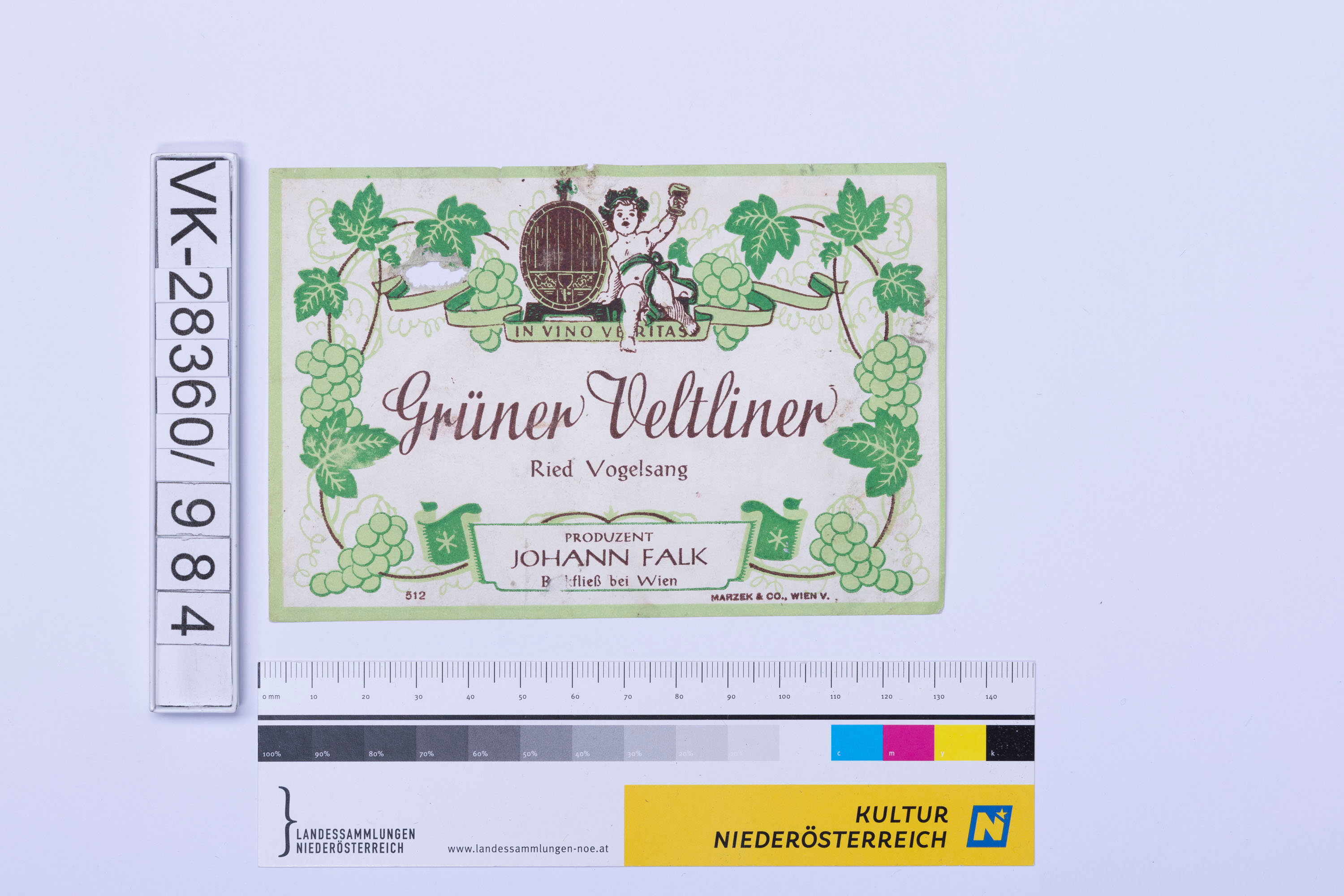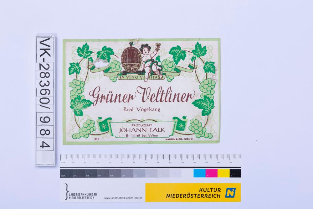 Abgelöstes Weinflaschenetikett aus einer Sammlung von den 1940er bis zu den frühen 1960er Jahren; Weinsorte: "Grüner Veltliner Ried Vogelsang", Darstellung einer Figur mit Weinglas,- einem Weinfass und -reben; Weinbau, Kellerei bzw. Handel: "PRODUZENT JOHANN FALK Bockfließ bei Wien"