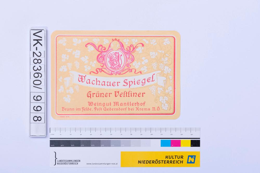 Abgelöstes Weinflaschenetikett aus einer Sammlung von den 1940er bis zu den frühen 1960er Jahren; Weinsorte: "Wachauer Spiegel Grüner Veltliner", Wappendarstellung und Weinreben; Weinbau, Kellerei bzw. Handel: "Weingut Mantlerhof Brunn im Felde, Post Gedersdorf bei Krems, N.Ö."