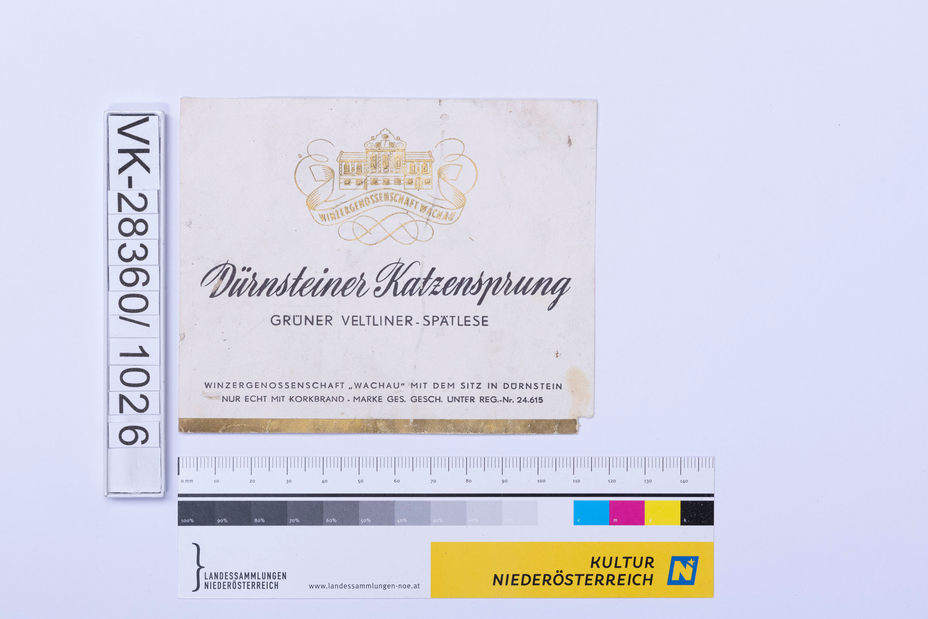 Abgelöstes Weinflaschenetikett aus einer Sammlung von den 1940er bis zu den frühen 1960er Jahren; Weinsorte: "Dürnsteiner Katzensprung GRÜNER VELTLINER", Markenzeichen; Weinbau, Kellerei bzw. Handel: "WINZERGENOSSENSCHAFT "WACHAU" MIT DEM SITZ IN DÜRNSTEIN
