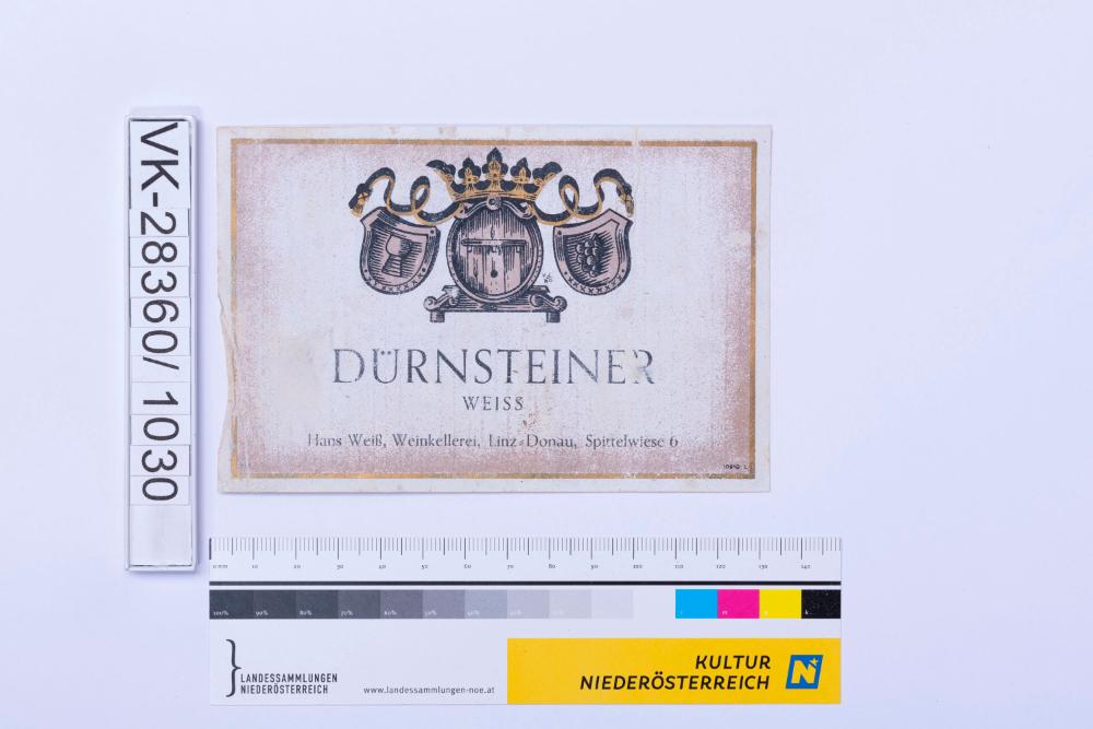 Abgelöstes Weinflaschenetikett aus einer Sammlung von den 1940er bis zu den frühen 1960er Jahren; Weinsorte: "DÜRNSTEINER WEISS", Darstellung von Weinfass, -glas und -reben mit Krone; Weinbau, Kellerei bzw. Handel: "Hans Weiß, Weinkellerei, Linz=Donau, Spittelwiese 6"
