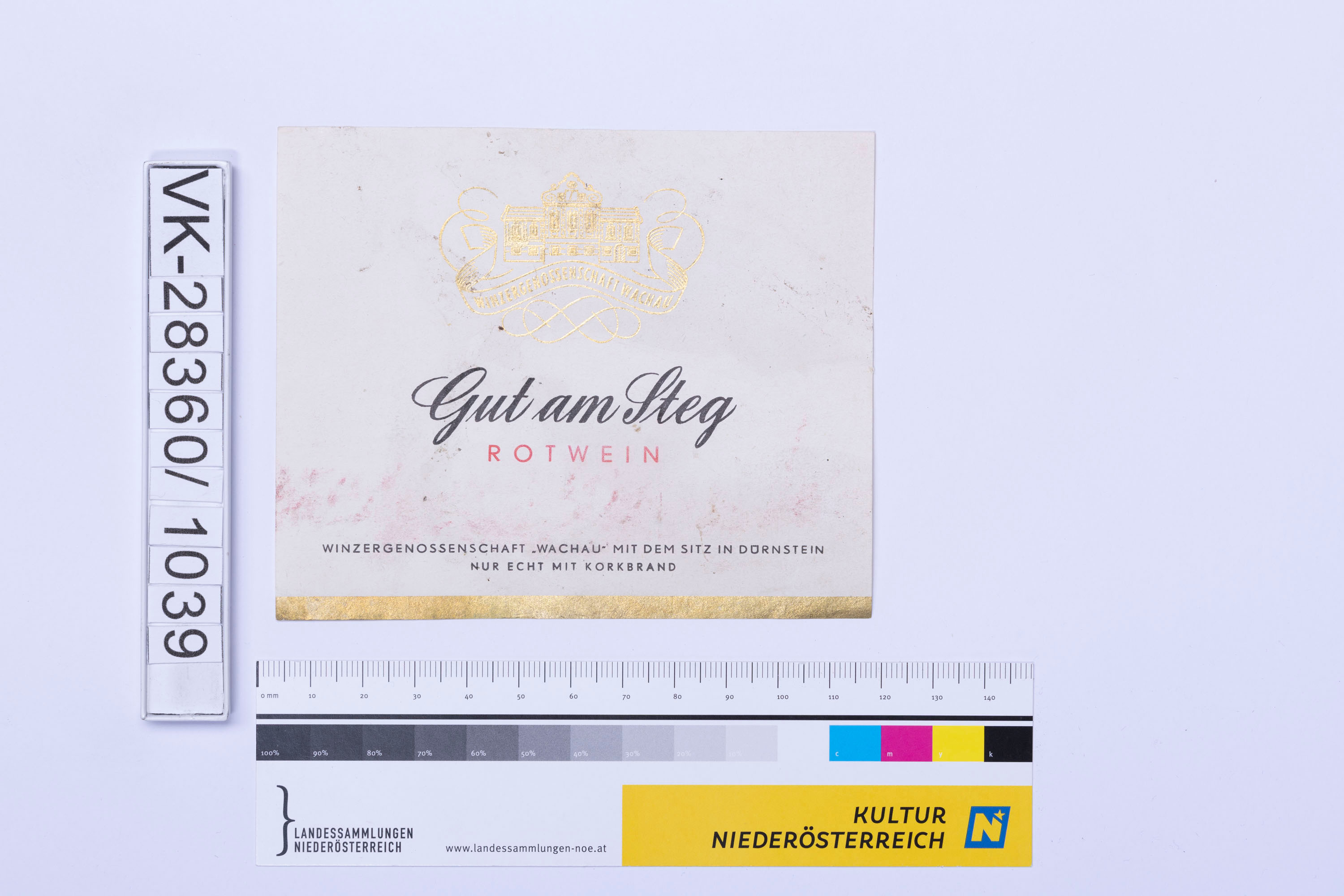 Abgelöstes Weinflaschenetikett aus einer Sammlung von den 1940er bis zu den frühen 1960er Jahren; Weinsorte: "Gut am Steg ROTWEIN", Markenzeichen; Weinbau, Kellerei bzw. Handel: "WINZERGENOSSENSCHAFT "WACHAU" MIT DEM SITZ IN DÜRNSTEIN"