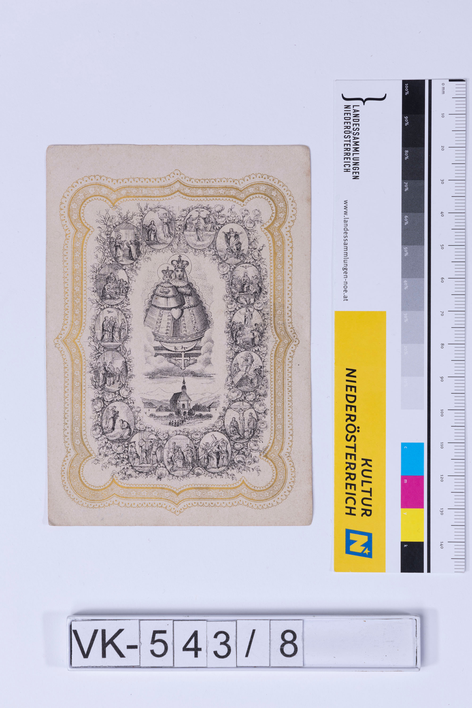 Maria Enzersdorf; Voderseite: Gnadenbild Maria Enzersdorf, Engel, Kirche und Bibledarstellungen; Rückseite: Gebet, "Verlag v. Schaufele & Schapperle, Stuttgart"