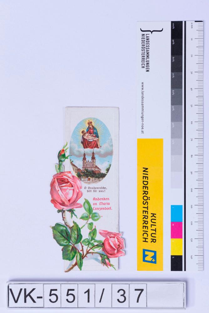 Vorderseite: Gnadenbild Maria Lanzendorf (Pieta), Kirchendarstellung, Beschriftung, stilisiert floral eingerahmt; Rückseite: Bittgesuch