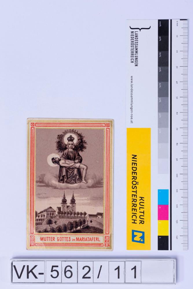 Vorderseite: Gnadenbild Maria Taferl mit Darstellung der Basilika, Beschriftung: "MUTTER GOTTES in MARIATAFERL"; Rückseite: Gebet
