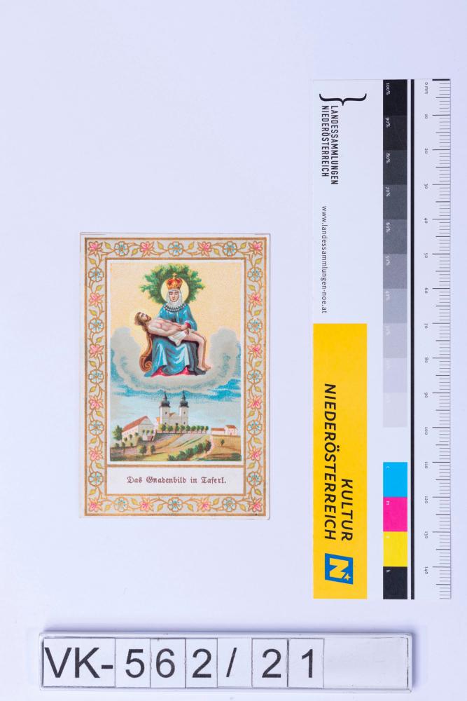 Vorderseite: Gnadenbild Maria Taferl mit Darstellung der Basilika, Beschriftung: "Das Gnadenbild in Taferl."; Rückseite: Gebet