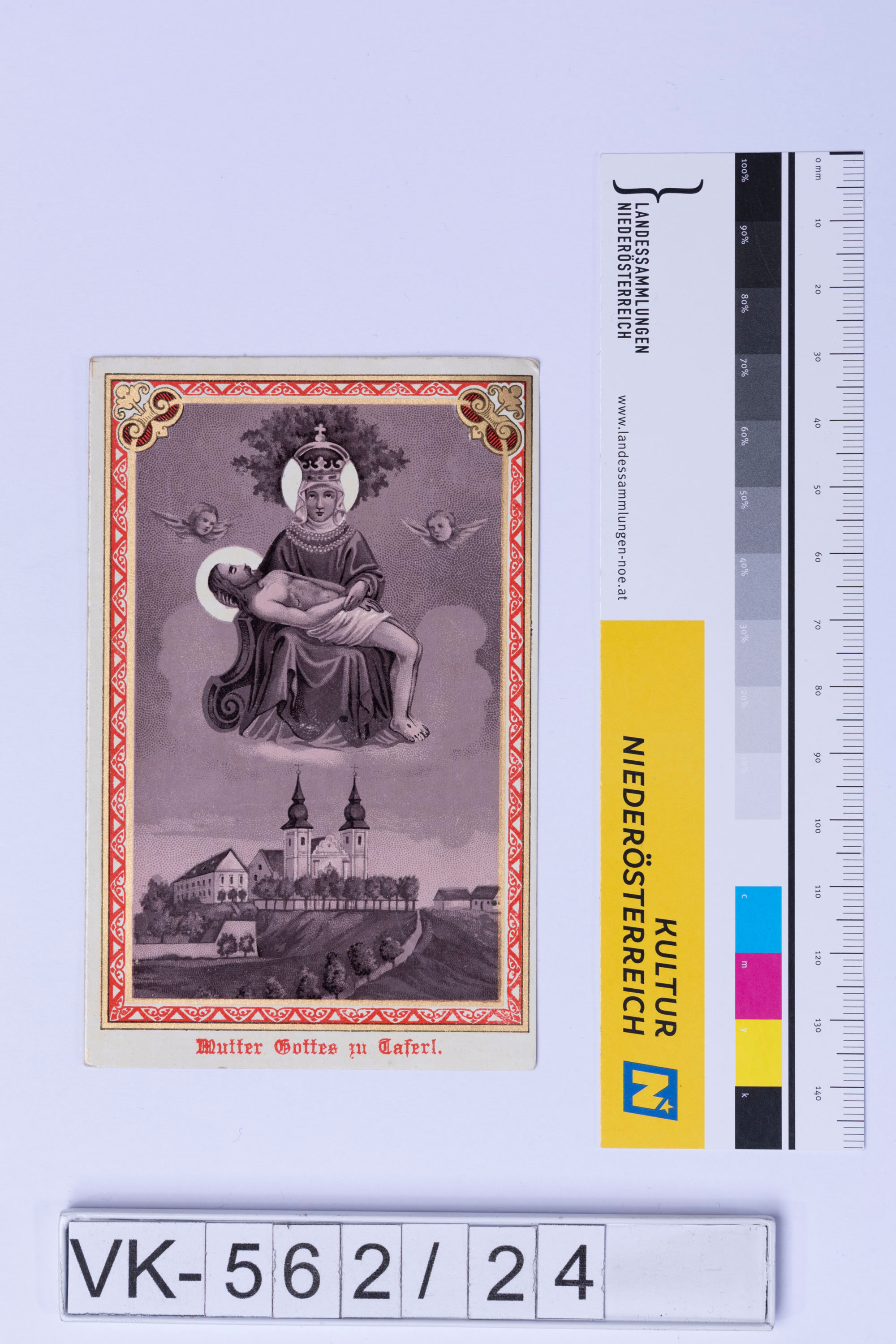 Vorderseite: Gnadenbild Maria Taferl mit Darstellung der Basilika, Beschriftung: "Mutter Gottes zu Taferl."; Rückseite: Gebet