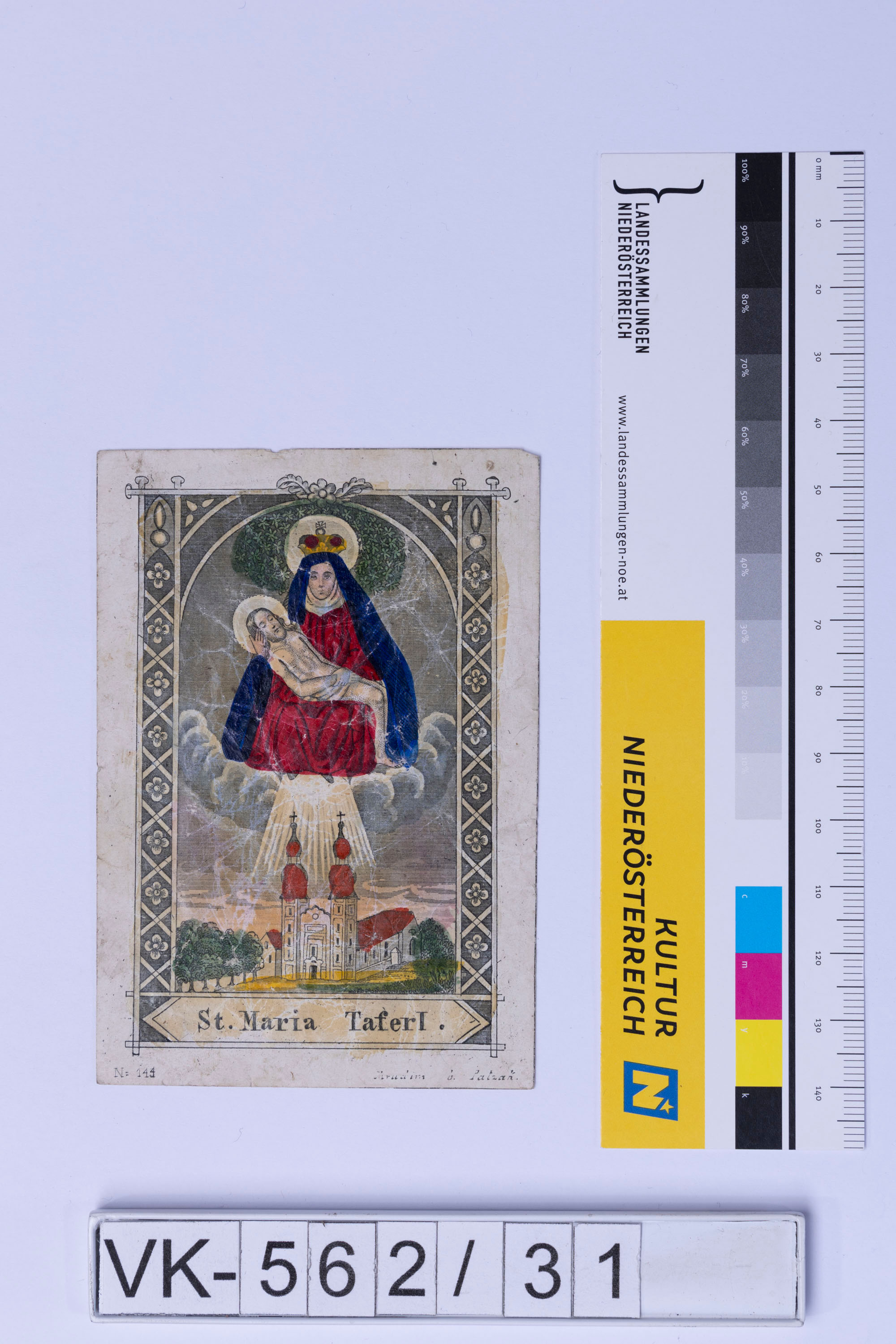 Jesus Christus mit Dornenkrone und Maria in himmlischer Szenerie (Pieta), Kirchendarstellung, Beschriftung: "St. Maria Taferl"