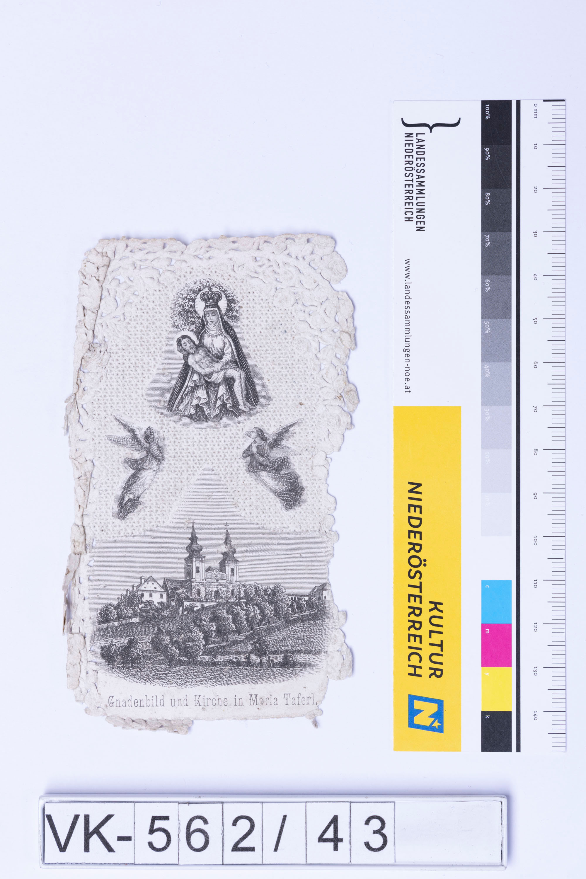 Vorderseite: Gnadenbild Maria Taferl mit Darstellung der Basilika, Beschriftung: "Gnadenbild und Kirche in Maria Taferl"; Rückseite: Gebet