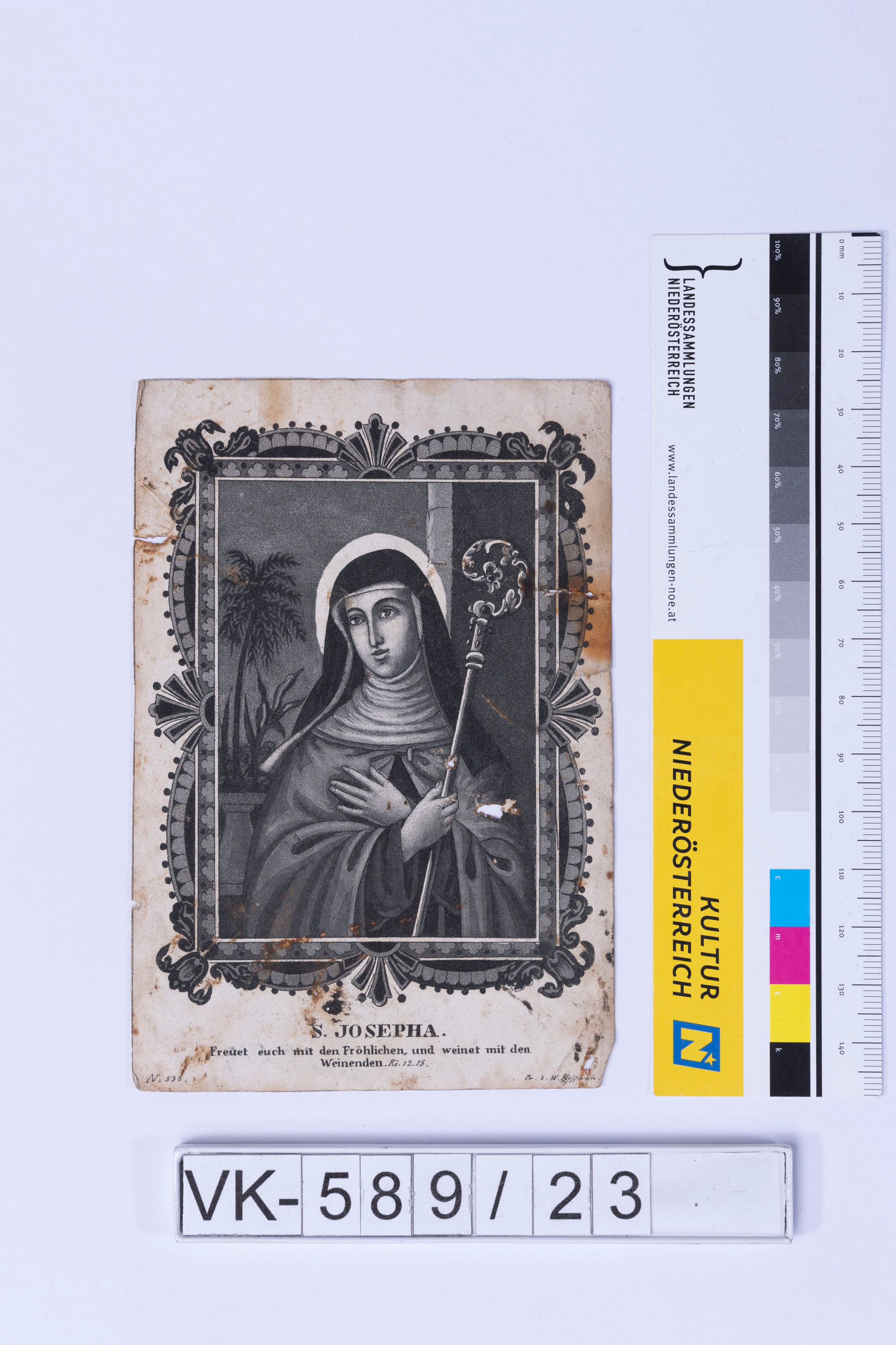 Heiligendarstellung (Josefa in Ordensgewand) mit Kreuz, Beschriftung