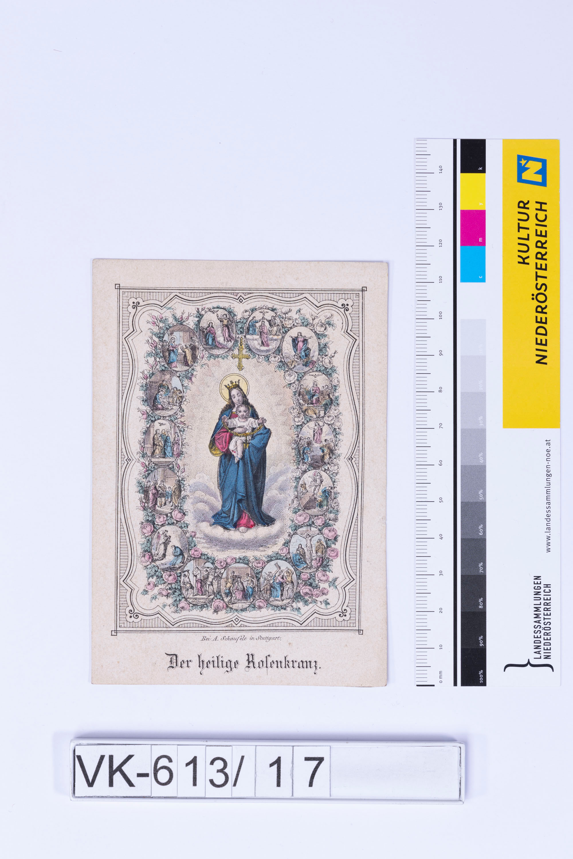 Vorderseite: Heiligendarstellung (Maria) und Kind, eingerahmt von biblischen Szenen, Beschriftung: "Der heilige Rosenkranz."; Rückseite: "Marianische Ehrenkrone, geflochten a.d. Geheimnissen u. Früchten d.hl. Rosenkranzes."