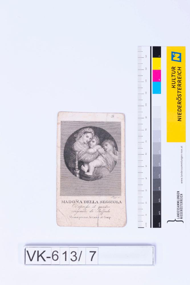 Heiligendarstellung (Maria) mit Kind und Johannesknaben; Beschriftung: "MADONNA DELLA SEGGIOLA"