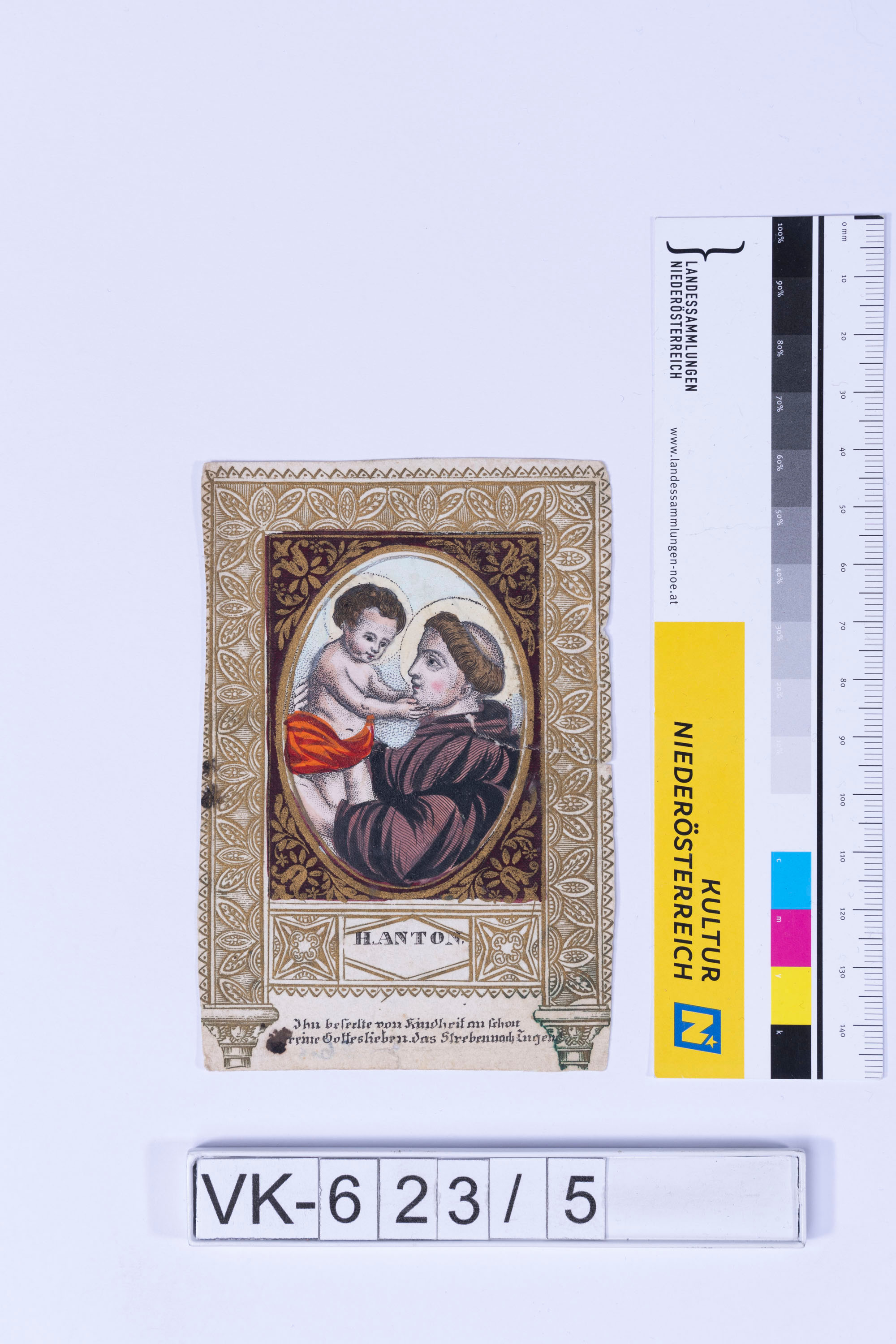 Vorderseite: Heiligendarstellung (Antonius in Ordensgewand) mit Jesuskind, Spruch; Rückseite: handschriftliche Notiz
