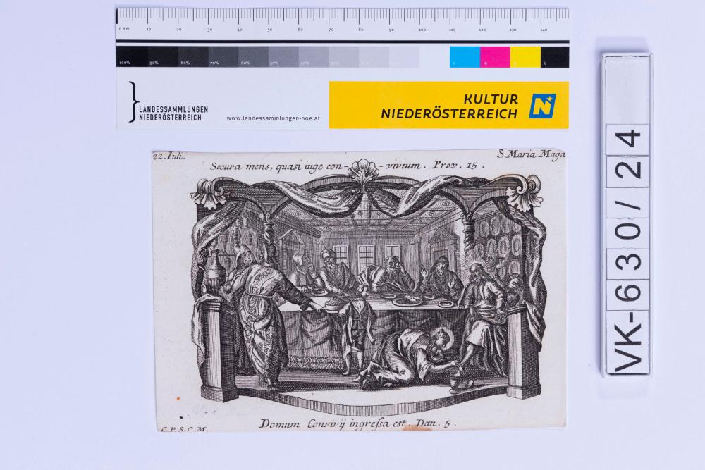 Heiligendarstellung (Maria Magdalena) mit der Fußwaschung Jesu Christi , lateinische Beschriftung
