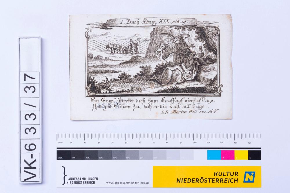 Altes Testament; Elija am Horeb, Beschriftung: "Ein Engel stärcket dich zum Lauff auf vierzig Tage, Gott gibt Elijam zu, daß er die Last mit trage."